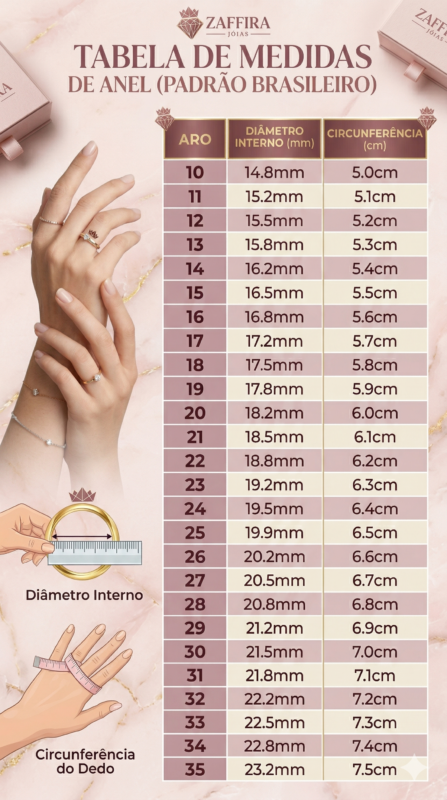 - Dica Rápida: Pegue um anel que você já usa e meça a parte interna (o diâmetro) com uma régua.